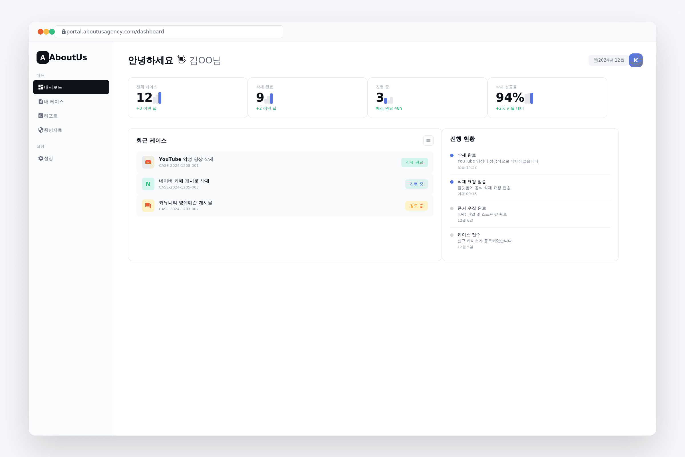 A. 어바웃어스는 단순 신고가 아니라 게시물의 유통 구조·CDN·재게시 경로를 분석한 뒤 삭제 권한이 있는 지점을 기준으로 삭제를 집행합니다. 삭제 이후에는 결과를 증빙 자료로 정리해 제공합니다.